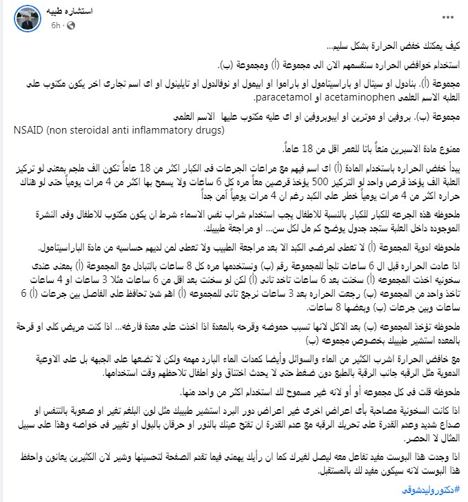 وكتب الدكتور وليد شوقي تدوينة على الفيس بوك: كيف يمكنك خفض الحرارة بشكل سليم... استخدام خوافض الحراره سنقسمهم الان الى مجموعة (أ) ومجموعة (ب).