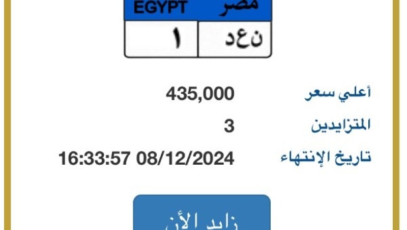 ومن ضمن اللوحات التي تتم عليها المُزايدة لوحة تحمل رقم (ن ع د-1)، ووصل سعرها حتى الآن لـ 435 ألف جنيه، وينتهي المزايدة عليها اليوم 8-12-2024 ويتزايد عليها 3 أشخاص .