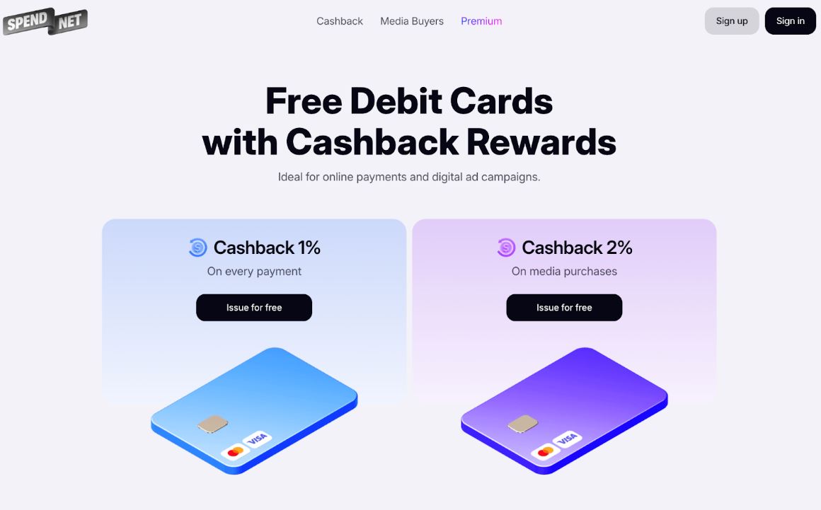 خدمة Spend.net تصدر بطاقات افتراضية بالدولار وبطاقات للإعلانات. جميع البطاقات مجانية وتعمل عبر Visa وMastercard. الميزة أنها تعطي 1% كاش باك على كل عملية شراء. عدد البطاقات غير محدود ولا توجد حدود على النفقات.