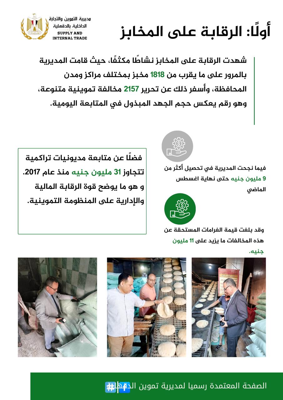 شهدت الرقابة على المخابز نشاطًا مكثفًا، حيث تم المرور على 1818 مخبزًا بمختلف مراكز ومدن المحافظة، وأسفر ذلك عن تحرير 2157 مخالفة تموينية متنوعة.