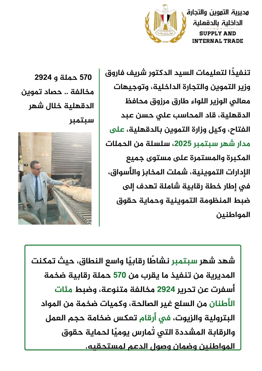 حيث قاد علي حسن عبد الفتاح، وكيل وزارة التموين بالدقهلية، خلال شهر سبتمبر 2025، سلسلة من الحملات المكبرة والمستمرة على مستوى جميع الإدارات التموينية، شملت المخابز والأسواق، في إطار خطة رقابية شاملة تهدف إلى ضبط المنظومة التموينية وحماية حقوق المواطنين .. تنفيذًا لتعليمات الدكتور شريف فاروق، وزير التموين والتجارة الداخلية، وتوجيهات اللواء طارق مرزوق، محافظ الدقهلية ..