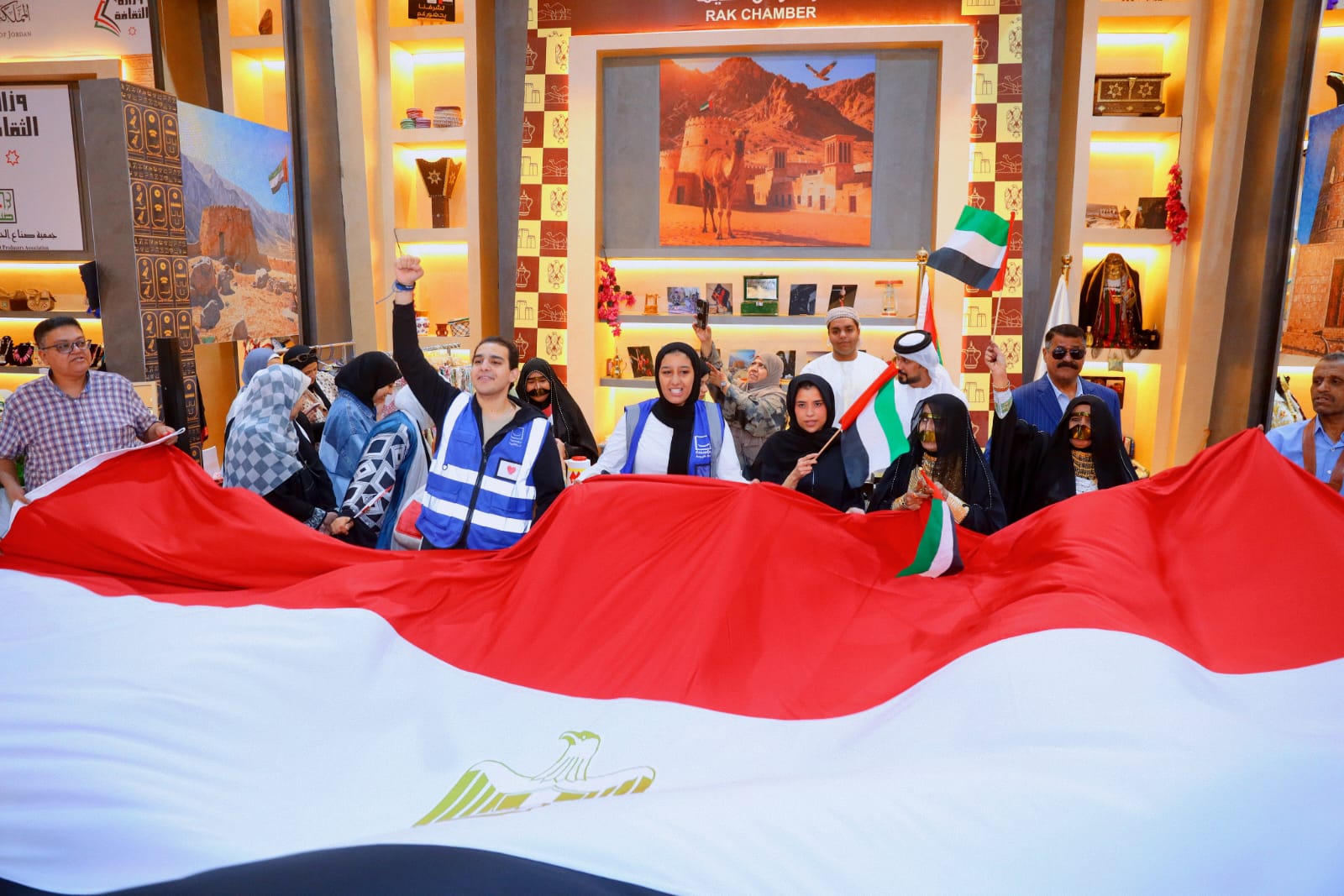 شهدت أروقة المعرض أجواءً وطنية مبهجة، حيث رُفعت الأعلام المصرية والإماراتية وتعالت الأغاني الوطنية، وقدمت فرقة المزيود الحربية الإماراتية المرافقة للوفد وصلات غنائية من الفلكلور الشعبي والتراث الإماراتي.