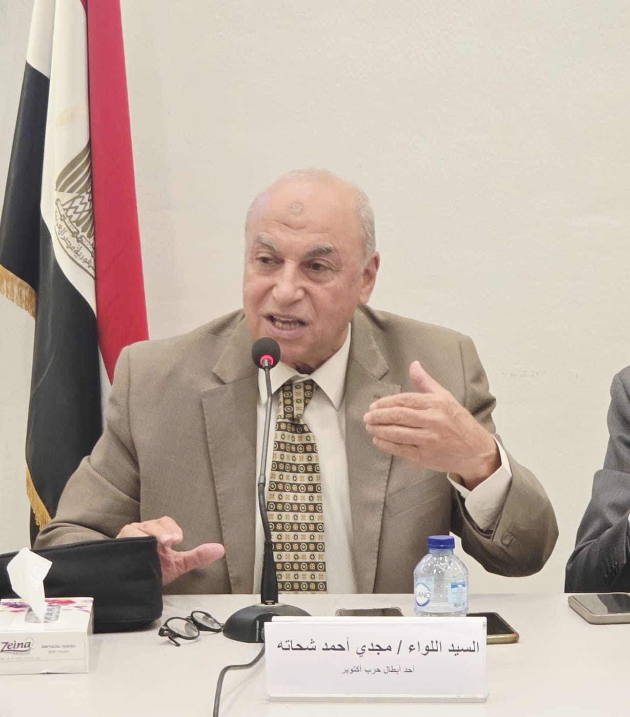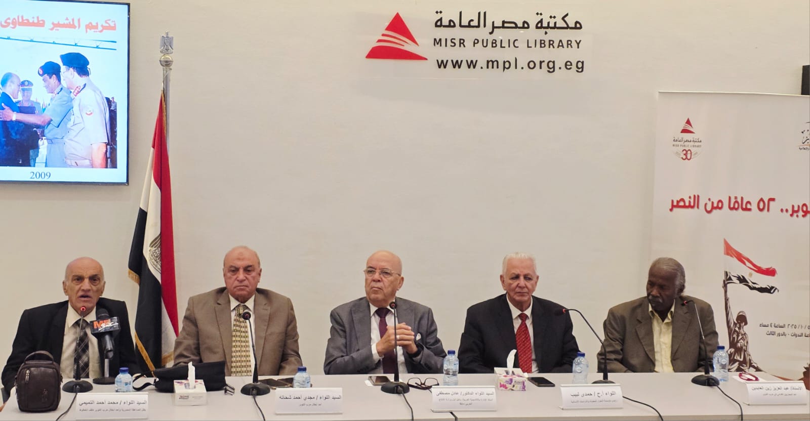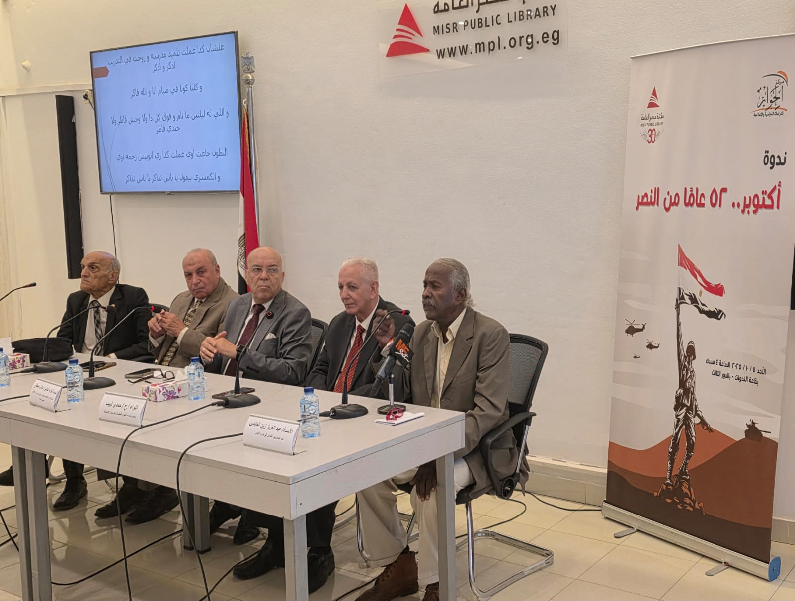 نظم مركز الحوار للدراسات السياسية والإعلامية بالتعاون مع مكتبة مصر العامة ندوة بعنوان "أكتوبر ... ٥٢ عامًا من النصر" تحدث فيها أبطال وقيادات حرب أكتوبر المجيدة والاستنزاف، عن البطولات والمعارك التي خاضها الجيش المصري ضد العدو الإسرائيلي لاستعادة الأراضي المصرية.