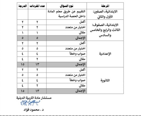 كما أكدت وزارة التربية والتعليم والتعليم الفني ، على الالتزام بما ورد في فاكس الإدارة المركزية للتعليم العام في 9 أكتوبر بشأن تنظيم أعمال الامتحانات والتقييم بمادة التربية الدينية لجميع المراحل التعليمية ، مع الالتزام بمواصفات الورقة الامتحانية والدرجات والمفردات التالية: