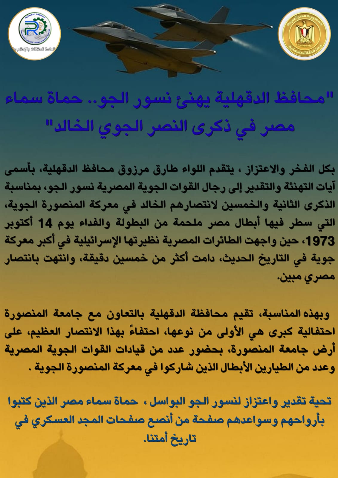 كما استعرض المحافظ مع التلاميذ أحداث معركة المنصورة الجوية في 14 أكتوبر 1973، موضحًا أنها صفحة مضيئة في سجل المجد الوطني وبطولة تخلّدها السماء والأرض، مشيرًا إلى أن أبناء الدقهلية كان لهم شرف المشاركة فيها دفاعًا عن الوطن وعزته.