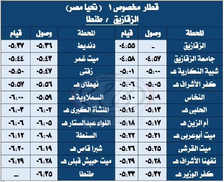 تقرر تشغيل مخصوص رقم ( 1 ) من طنطا إلى الزقازيق حيث يقوم من طنطا الساعة 02:00 ويصل الزقازيق الساعة 03:50 ، على أن يعود من الزقازيق الساعة 04:55 ويصل طنطا الساعة 06:35 طبقاً للجداول المرفقة .