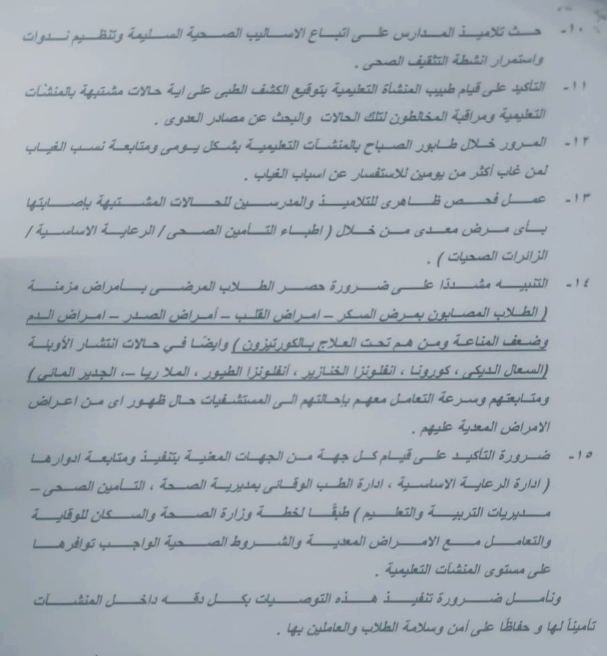تخصيص متابعة خاصة للطلاب المصابين بأمراض مزمنة، واتخاذ الإجراءات الطبية المناسبة فور ظهور أي أعراض.