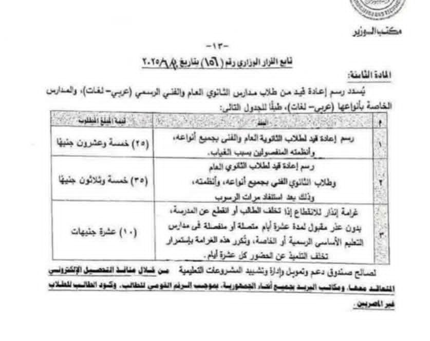 - تحديد رسم إعادة قيد طلاب الثانوي العام والفني بجميع أنواعه و انظمته المفصولين بسبب الغياب بمبلغ 25 جنيها