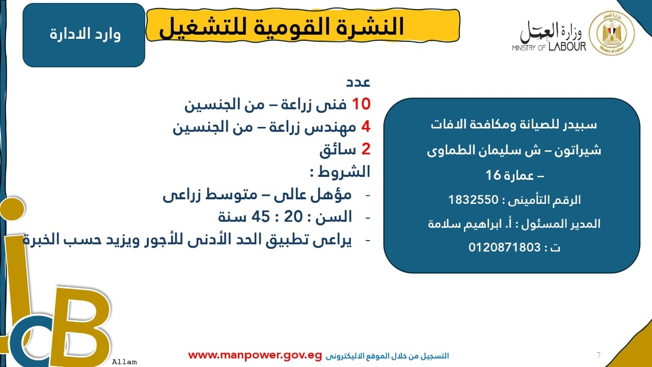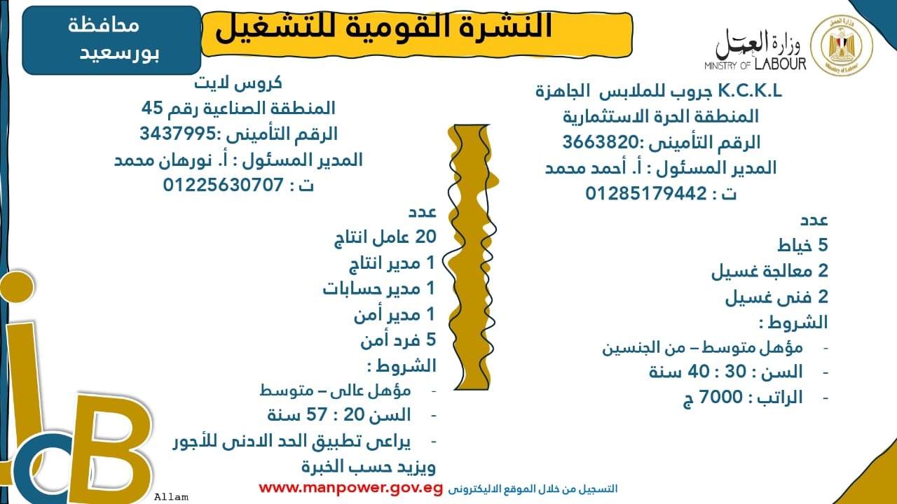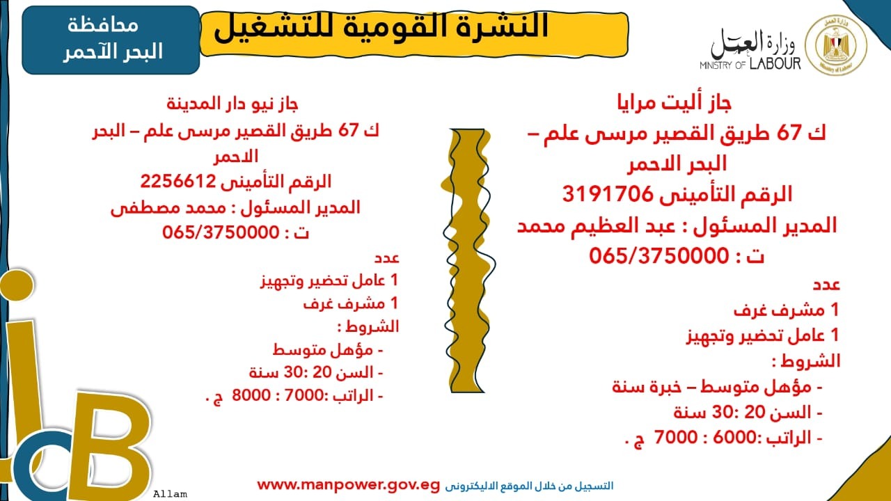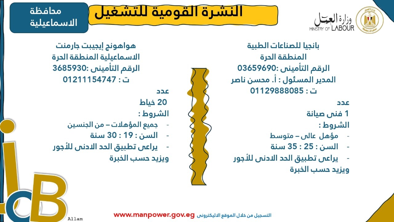 وبيّنت الوزارة أن التقديم على هذه الفرص الجديدة يتم خلال شهر نوفمبر 2025، من خلال الإدارة العامة للتشغيل بمقر الوزارة القديم بمدينة نصر، أو عبر مديريات العمل في المحافظات، كما يمكن التقديم مباشرةً من خلال بيانات الشركات المرفقة بالنشرة، أو عبر الموقع الرسمي لوزارة العمل على شبكة الإنترنت.