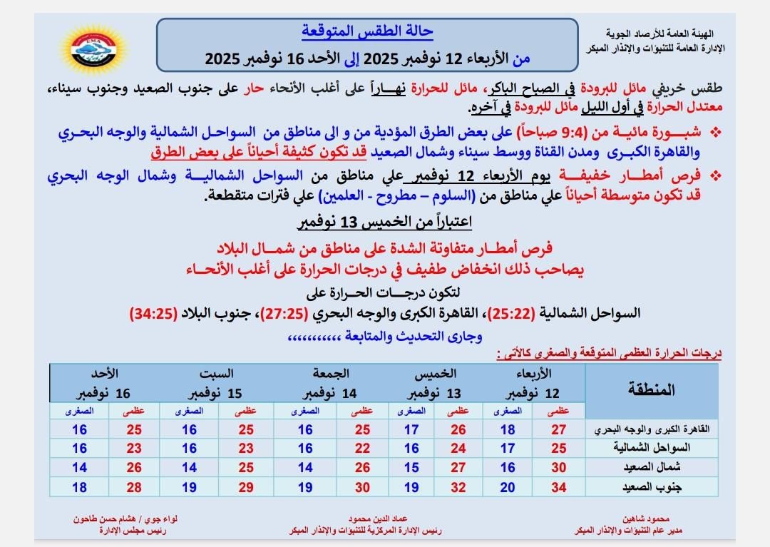 تشهد البلاد حالة من التقلبات الجوية اعتبارًا من الخميس 13 نوفمبر الجاري، وفق ما أعلنت الهيئة العامة للأرصاد الجوية التي أكدت أن مصر ستتعرض لتقلبات جوية تشمل أمطارًا متفاوتة الشدة على عدد من المناطق، إلى جانب انخفاض في درجات الحرارة قد يقترب من الصفر في بعض المناطق الشمالية، في أول موجة باردة قوية تضرب البلاد مع دخول النصف الثاني من فصل الخريف.