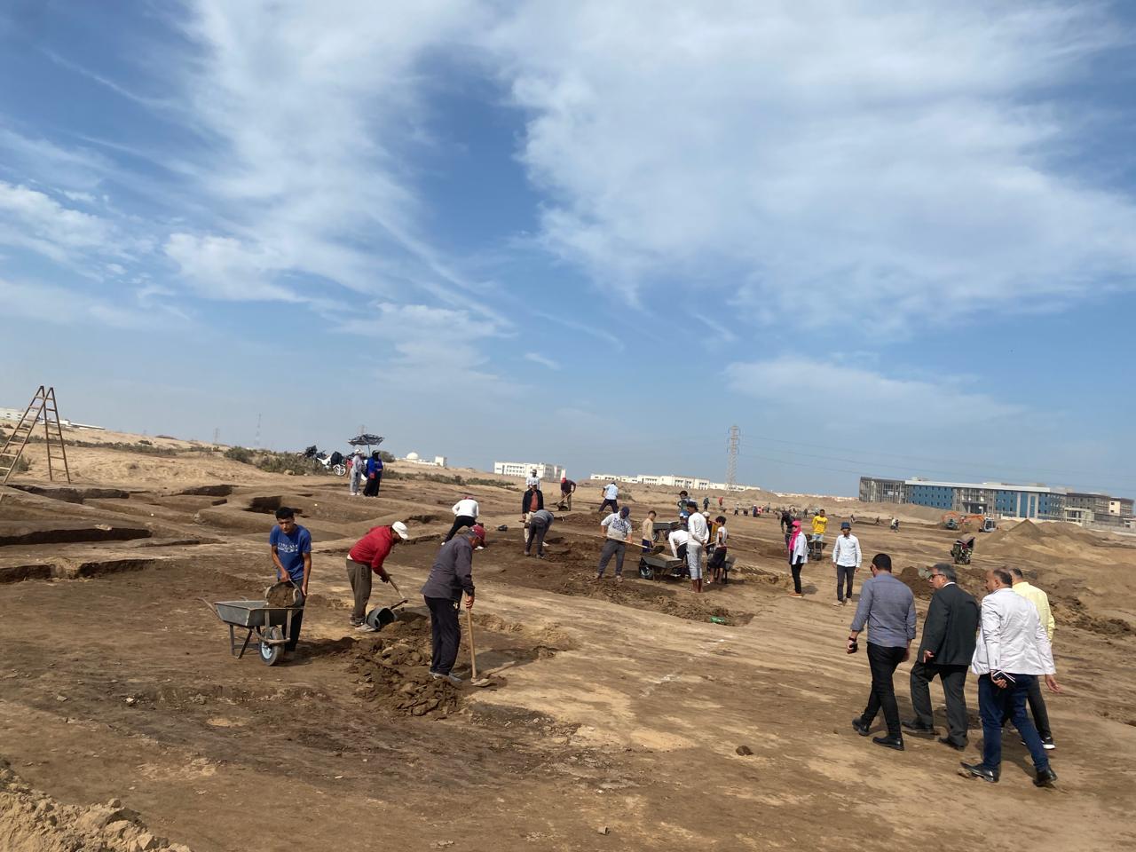 في بداية الجولة تابع " المحافظ " أعمال بعثة الحفائر المكلفة بمسح تل الحمامات الأثري بجمصة ، للتأكد من خلوّ الموقع من أي حفريات أو شواهد أثرية، على مساحة 83 فدانًا تم تخصيصها لصالح التنمية الصناعية، لتكون امتدادًا جديدًا للمنطقة الصناعية بجمصة لإقامة مصانع جديدة عليها ، مشيرًا الي انه تم حتى الآن الانتهاء من مسح 40 فدانًا، موجّهًا باستمرار العمل بنفس الجدية والسرعة، قائلاً إن أي إنشاءات صناعية لن تبدأ إلا بعد الانتهاء الكامل من أعمال المسح الأثري طبقًا للقانون، حفاظًا على حقوق الدولة وتراثها، وفي الوقت نفسه دعمًا للتوسع الصناعي المنظم.
