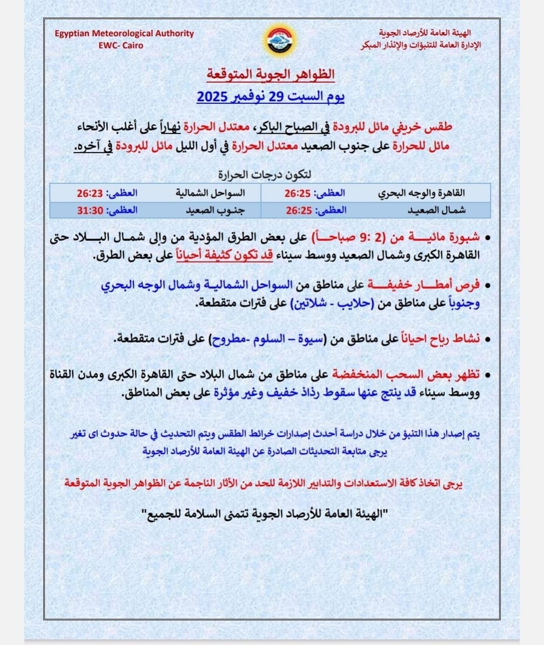 أعلنت الهيئة العامة للأرصاد الجوية توقعات حالة الطقس غدا، السبت 29 نوفمبر 2025، حيث يسود طقس خريفي مائل للبرودة في الصباح الباكر، معتدل الحرارة نهارًا على أغلب الأنحاء، بينما يميل للحرارة على جنوب الصعيد. أما ليلًا، فيكون مائلًا للبرودة إلى معتدل الحرارة على معظم المناطق.