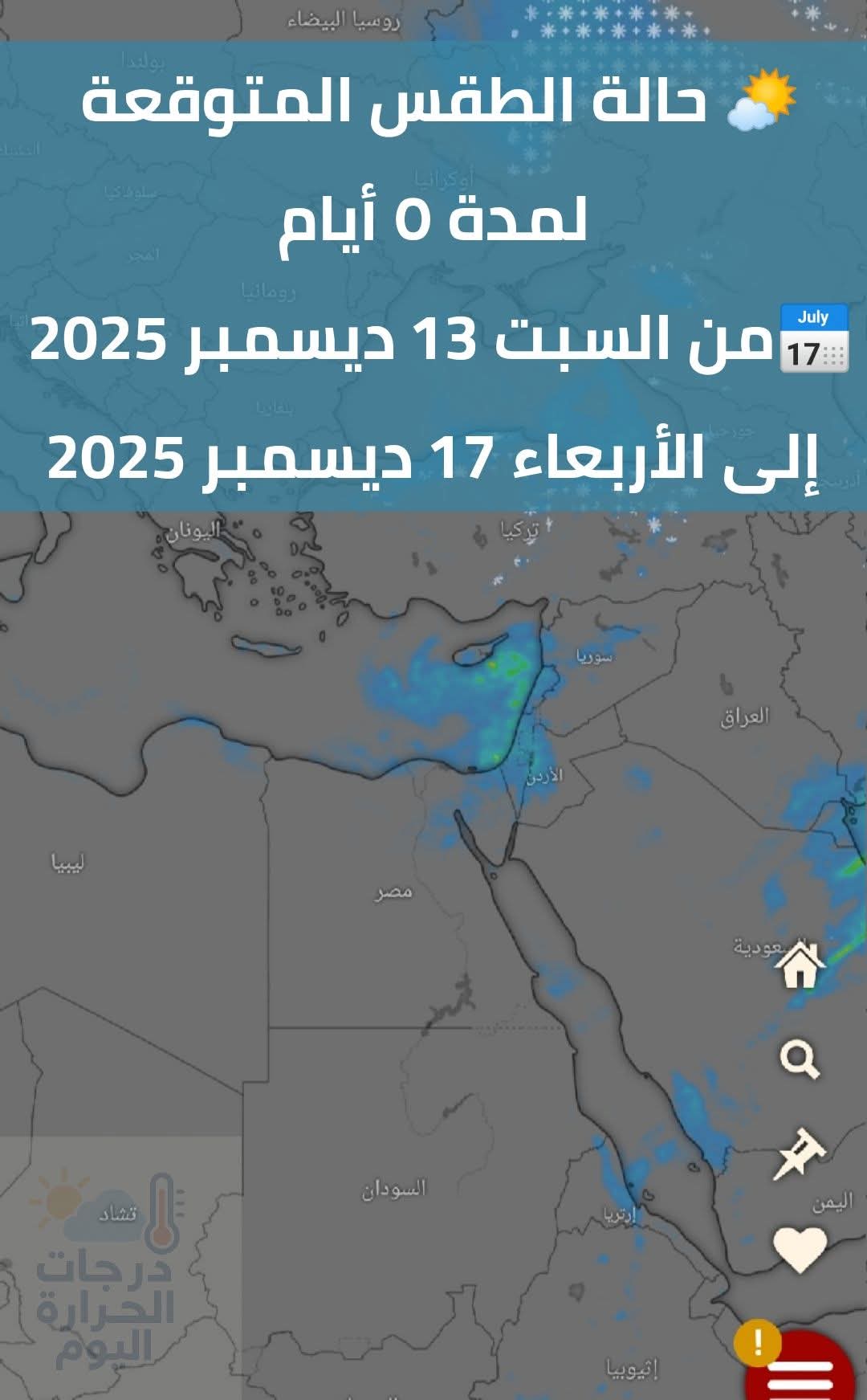 تعرف علي لمحات سريعة في حالة الطقس المتوقعة لمدة ٥ أيام اعتبارا من السبت 13 ديسمبر 2025 إلى الأربعاء 17 ديسمبر 2025م. .. .. والتي تأتي كالتالي: