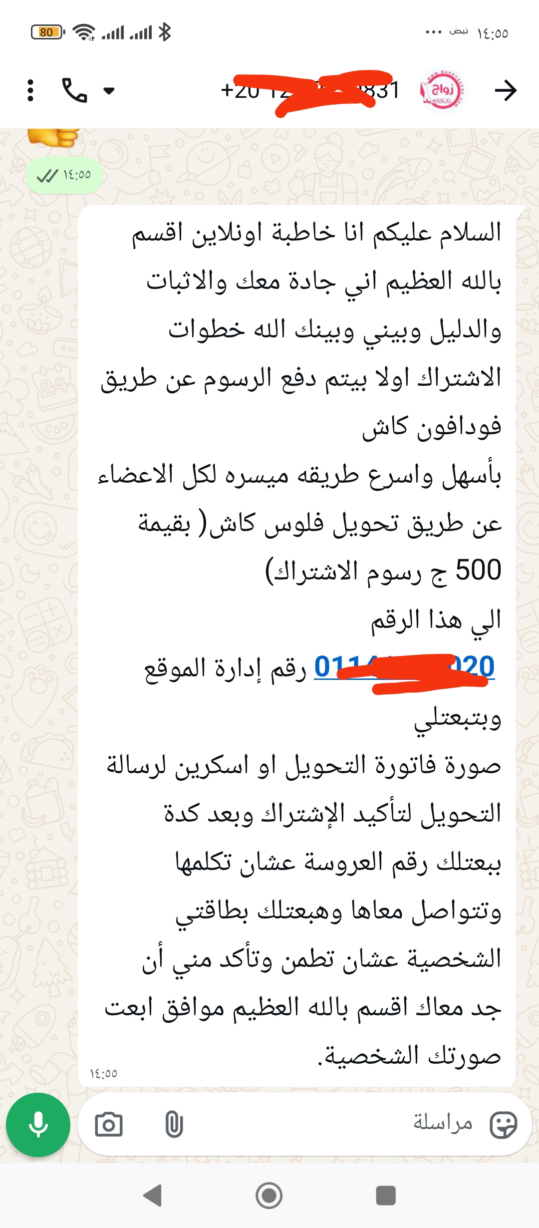 رسوم اشتراك – تحويل فوري عبر فودافون كاش – صورة إيصال – وعود بتسليم رقم “العروس” – ثم صمت، أو تسويف، أو طلب جديد.