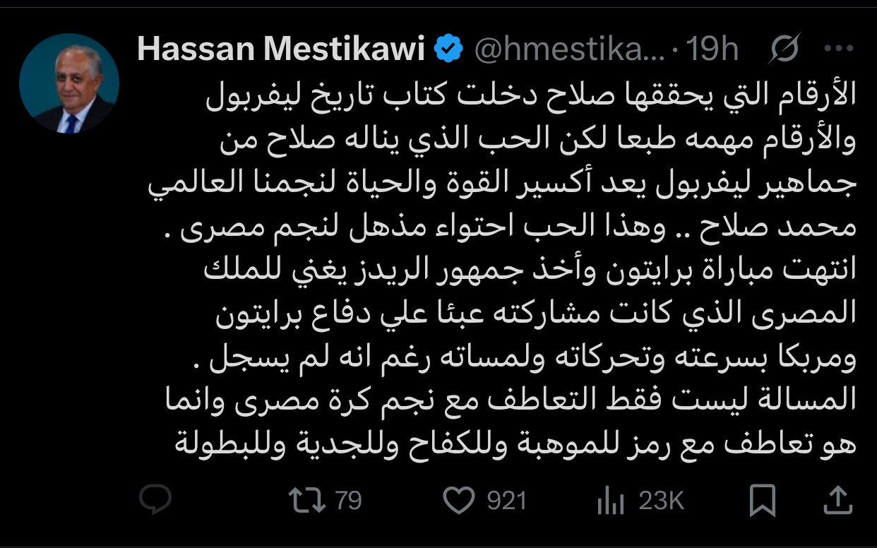وكتب المستكاوي: “الأرقام التي يحققها صلاح دخلت كتاب تاريخ ليفربول، والأرقام مهمه طبعا لكن الحب الذي يناله صلاح من جماهير ليفربول يعد أكسير القوة والحياة لنجمنا العالمي محمد صلاح .. وهذا الحب احتواء مذهل لنجم مصري”.