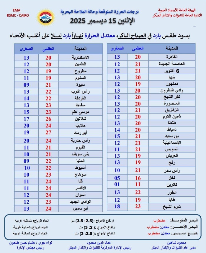 - السواحل الشمالية: الإسكندرية 20/13 – العلمين 20/12 – مطروح 19/12 – دمياط 20/14 – بورسعيد 21/15