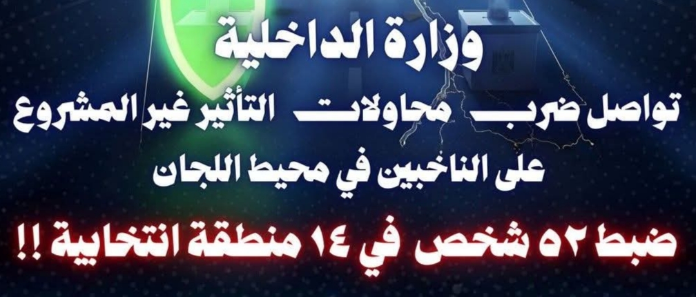حيث تم ضبط ٥٢ شخصًا في ١٤ منطقة انتخابية .. في إطار متابعة سير العملية الانتخابية .. فقد واصلت وزارة الداخلية جهودها لحماية إرادة الناخبين خارج اللجان ..