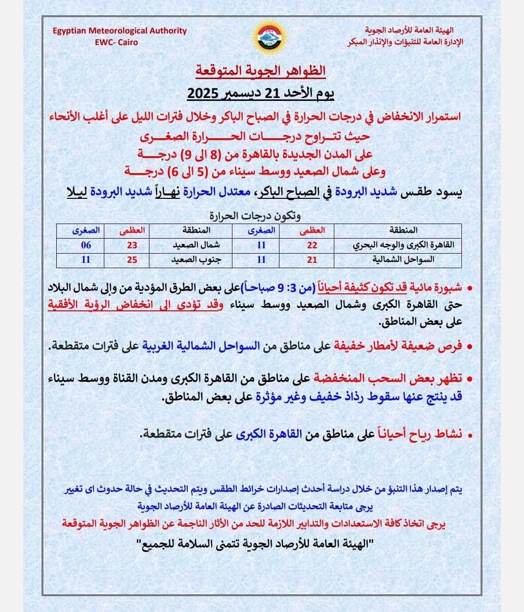 تتوقع الهيئة العامة للأرصاد الجوية أن يسود، اليوم الأحد وأيام التالية، طقس بارد في الصباح الباكر، مع اعتدال درجات الحرارة خلال النهار، وبارد ليلاً في معظم المناطق، حيث تتراوح درجات الحرارة الصغرى على المدن الجديدة بالقاهرة من «8 الى 9» درجات، وعلى شمال الصعيد ووسط سيناء من «5 الى 6» درجات.