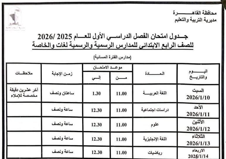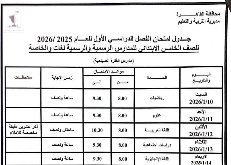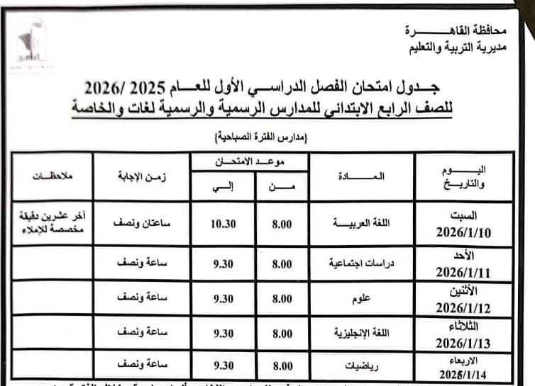- يؤدى طلبة وطالبات الصف الرابع والخامس والسادس الابتدائي وما يعادله امتحانات نصف العام 2026 محافظة القاهرة في الفترة من السبت ١٠ يناير حتى الأربعاء ١٤ يناير