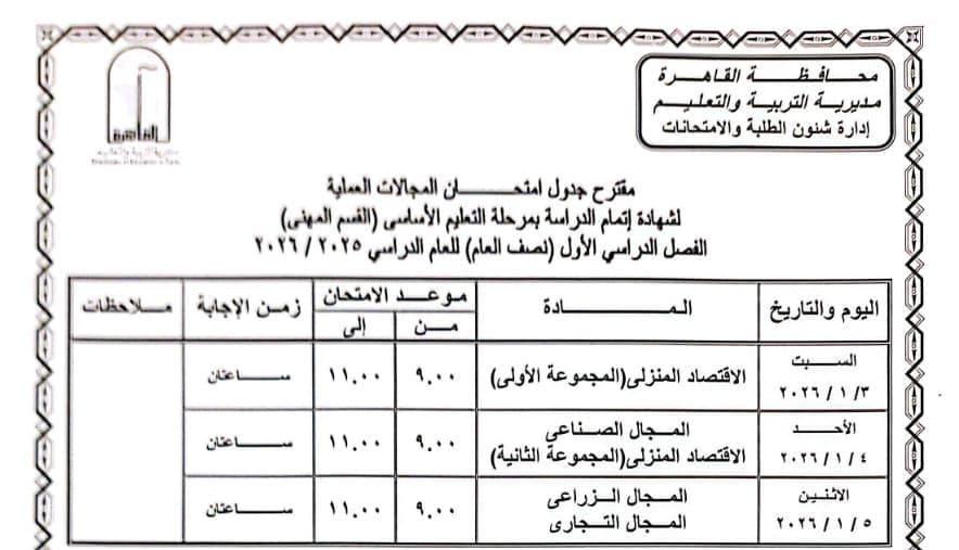 - تعقد امتحانات نصف العام 2026 محافظة القاهرة لصفوف النقل الإعدادي العام والرياضي والمهنى وما يعادله فى الفترة من السبت ١٠ يناير حتى الاربعاء ١٤ يناير