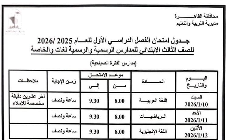 - يؤدي طلبةوطالبات الصف الثالث الابتدائي وما يعادله امتحانات نصف العام 2026 محافظة القاهرة في الفترة من السبت ١٠ يناير حتى الاثنين ١٢ يناير