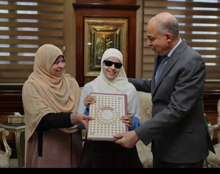 محافظ المنيا يُكرم الطالبة «فاطمة» ابنة مدرسة النور للمكفوفين ويُهديها مصحفًا تقديرًا لتميزها