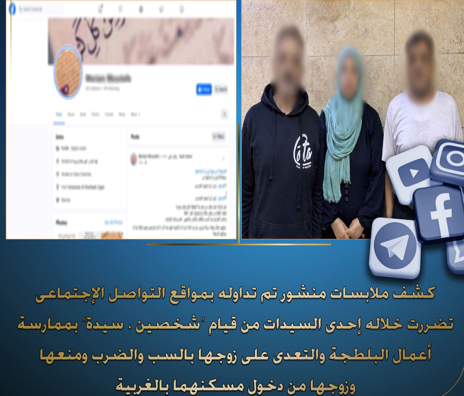 حيث قاموا بالتعدي عليها وزوجها بالسب والضرب، ما أسفر عن إصابة الزوج بكسر في اليد باستخدام أسلحة بيضاء، إضافة إلى التشهير بهما عبر مواقع التواصل ..