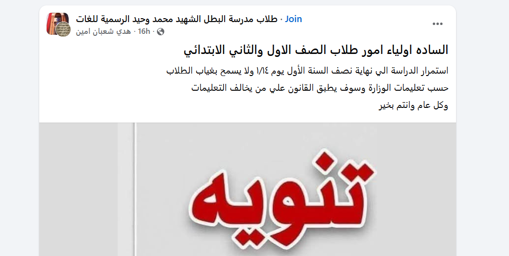 أعلنت الصفحات الرسمية للمدارس على فيس بوك ، صدور تعليمات تنص على استمرار الدراسة والحصص للصفين الأول والثاني الابتدائي حتى يوم 14 يناير 2026.