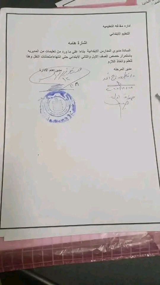 كما أعلنت إدارة مغاغة التعليمية بمحافظة المنيا ، تعليمات عاجلة لمديري المدارس الابتدائية بإستمرار الدراسة لتلاميذ الصفين الأول والثاني الابتدائي حتى انتهاء امتحانات النقل لجميع الصفوف .