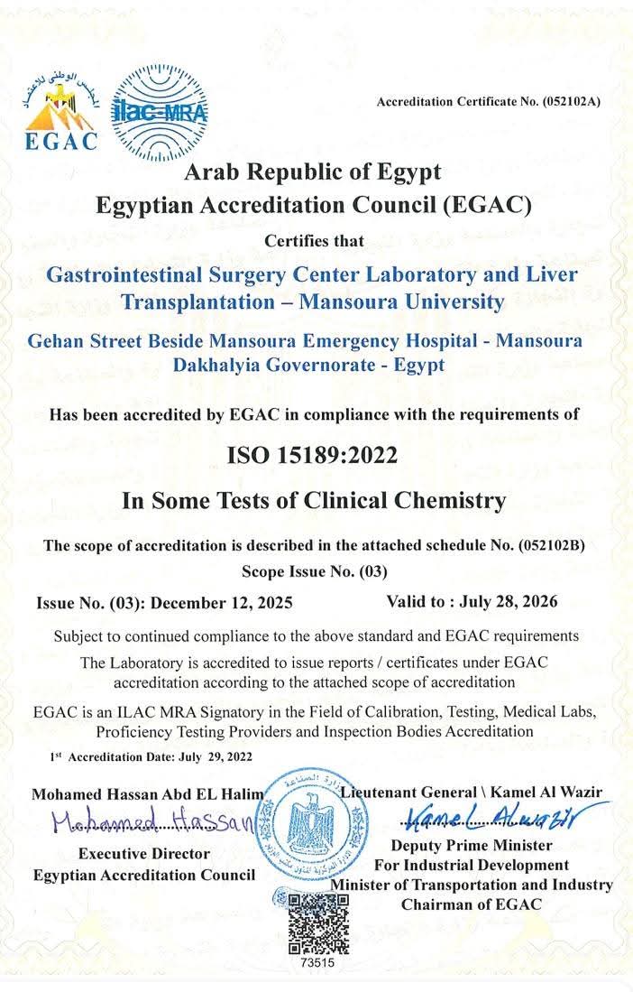 تعلن جامعة المنصورة عن تجديد اعتماد المجلس الوطني للاعتماد (EGAC) لمعامل مركز جراحة الجهاز الهضمي وزراعة الكبد، وذلك طبقًا للمواصفة الدولية ISO 15189:2022 في مجال بعض اختبارات الكيمياء الإكلينيكية، بما يعكس التزام المركز المستمر بتطبيق أعلى معايير الجودة والكفاءة الفنية في الخدمات المعملية المقدمة.