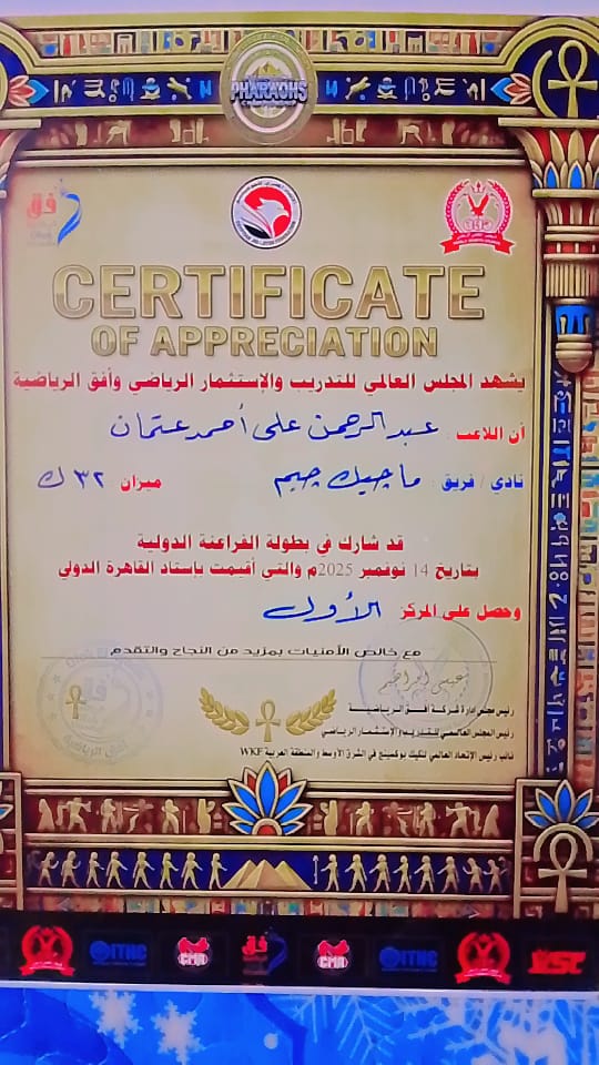وأكد القائمون على التكريم أن عبد الرحمن يُمثل نموذجًا ملهمًا للأطفال والشباب، ورسالة واضحة بأن الالتزام والانضباط والتدريب الجاد قادرون على صناعة أبطال حقيقيين منذ الصغر، ورفع اسم مصر عاليًا في البطولات الدولية.