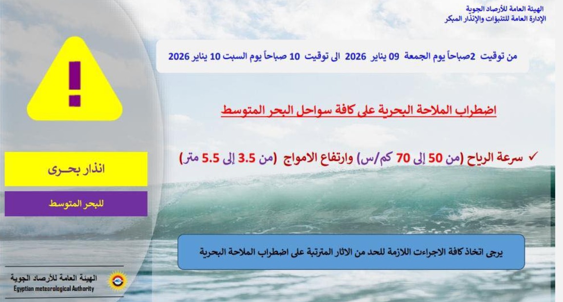أصدرت الهيئة العامة للأرصاد الجوية إنذارًا بحريًا يفيد باضطراب حركة الملاحة البحرية على كافة سواحل البحر المتوسط، حيث متوقع أن تتجاوز خلاله أمواج البحر الـ 5 أمتار على بعض السواحل.