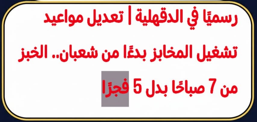 أعلن محمد فوزي، رئيس شعبة مخابز الدقهلية أن تعديل مواعيد تشغيل المخابز سيبدأ اعتبارًا من شهر شعبان المقبل وليس خلال الأيام القادمة كما أُشيع، على أن يبدأ إنتاج الخبز من الساعة ٧ صباحًا بدلًا من ٥ فجرًا.