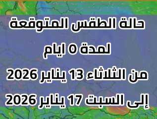 تعرف علي حالة الطقس ودرجات الحرارة المتوقعة اليوم الثلاثاء الموافق 13 من شهر يناير 2026م. .. .. والتي تأتي كالتالي:
