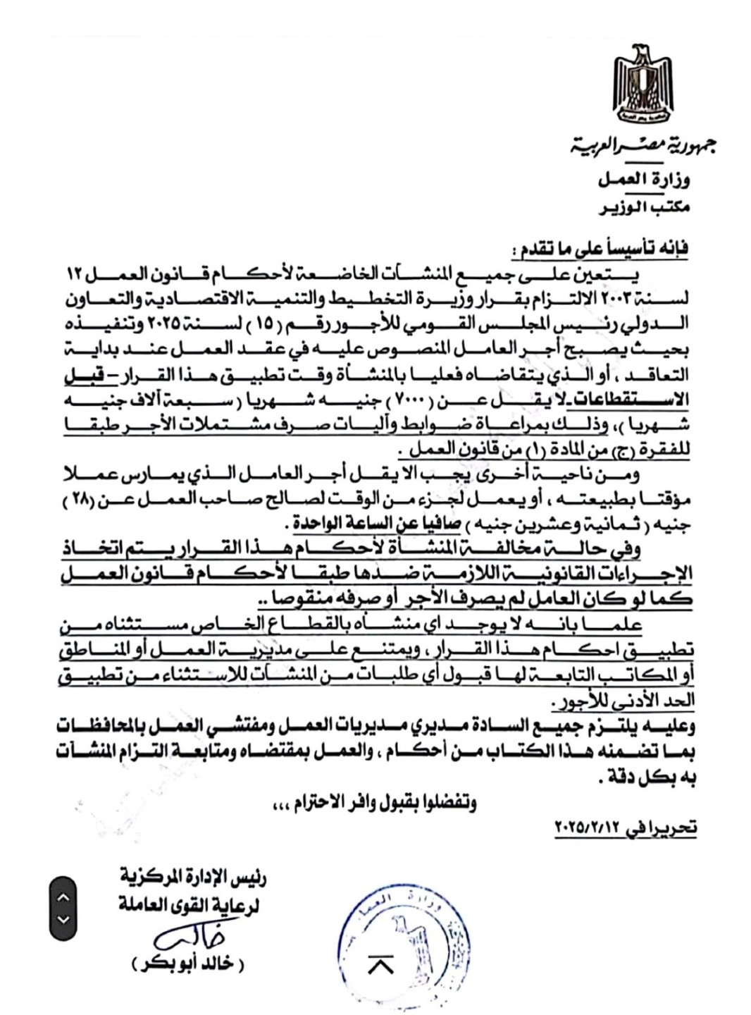 وأكد وزير العمل، أن هذا القرار يمثل خطوة مهمة ضمن منظومة القرارات التنفيذية لقانون العمل الجديد، ويهدف إلى حماية حقوق العمال وضمان بيئة عمل عادلة ومنظمة في القطاع الخاص، مع تحقيق التوازن بين مصالح أصحاب العمل والعاملين على حد سواء.