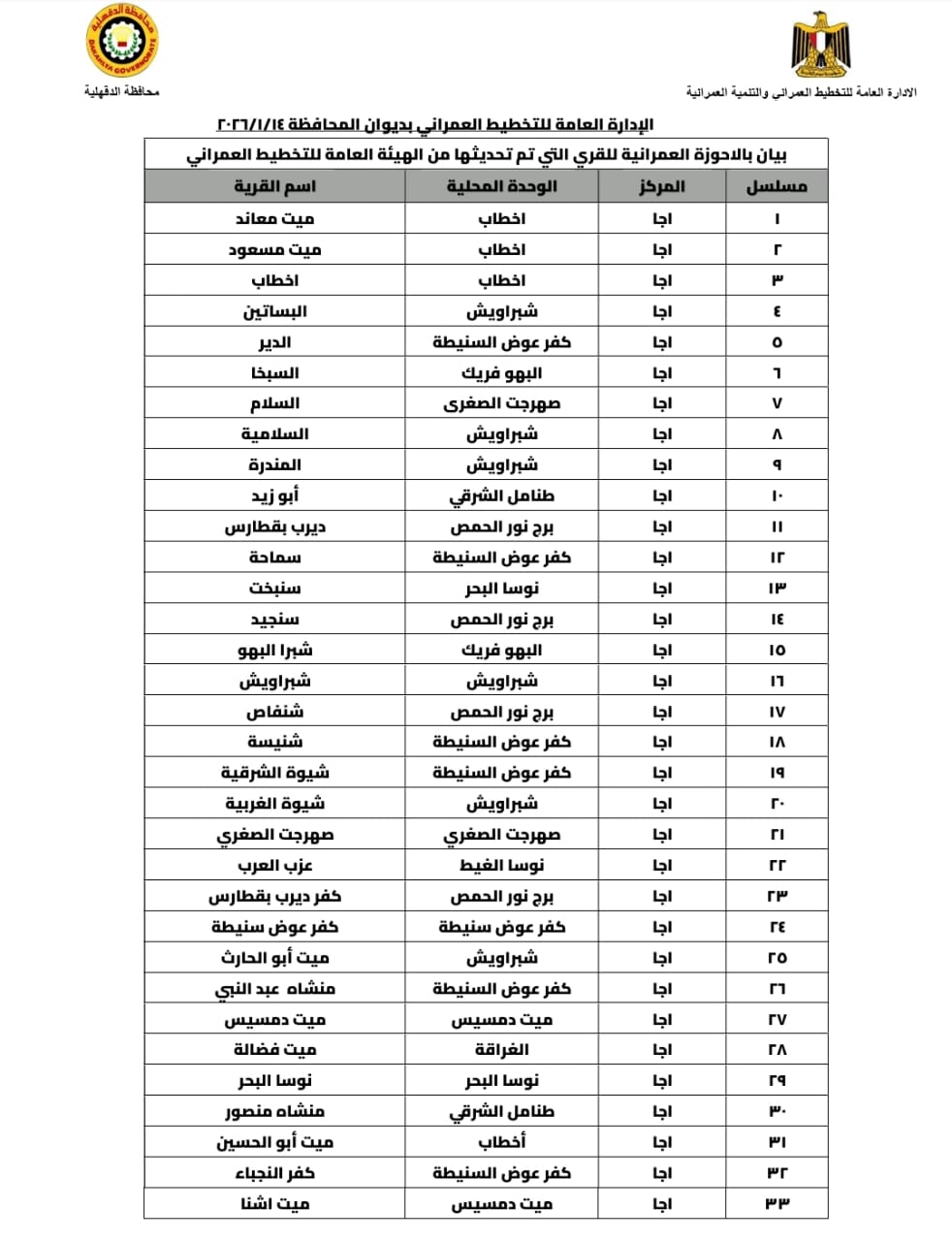 تعرف علي الأحوزة العمرانية لـ 64 قرية منهم 31 قرية بمركز ميت غمر التي اعتمدها محافظة الدقهلية
