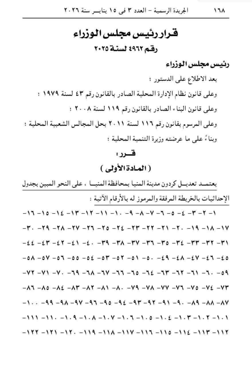أعلن اللواء عماد كدواني محافظ المنيا، صدور قرار رئيس مجلس الوزراء رقم (4962) لسنة 2025، بشأن اعتماد تعديل كردون مدينة المنيا، وذلك في إطار جهود الدولة لتنظيم التخطيط العمراني وتحقيق التنمية المستدامة.
