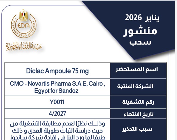 ووجهت هيئة الدواء، في منشورها الذي حمل رقم “1” لعام 2026، بسحب تشغيلة رقم «Y0011» من عقار DiclacAmpoule 75 mg.