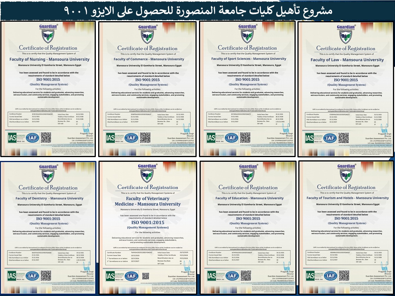 أعلن الدكتور شريف خاطر، رئيس جامعة المنصورة، اعتماد 16 كلية بالجامعة وفق متطلبات مواصفة ISO 9001:2015 لنظم إدارة الجودة، وذلك في إطار مشروع مؤسسي متكامل يعكس رؤية استراتيجية واضحة وتخطيطًا منهجيًا دقيقًا، ويستهدف توحيد السياسات والإجراءات، ورفع كفاءة الأداء، وترسيخ ثقافة الجودة والاستدامة داخل كليات الجامعة.