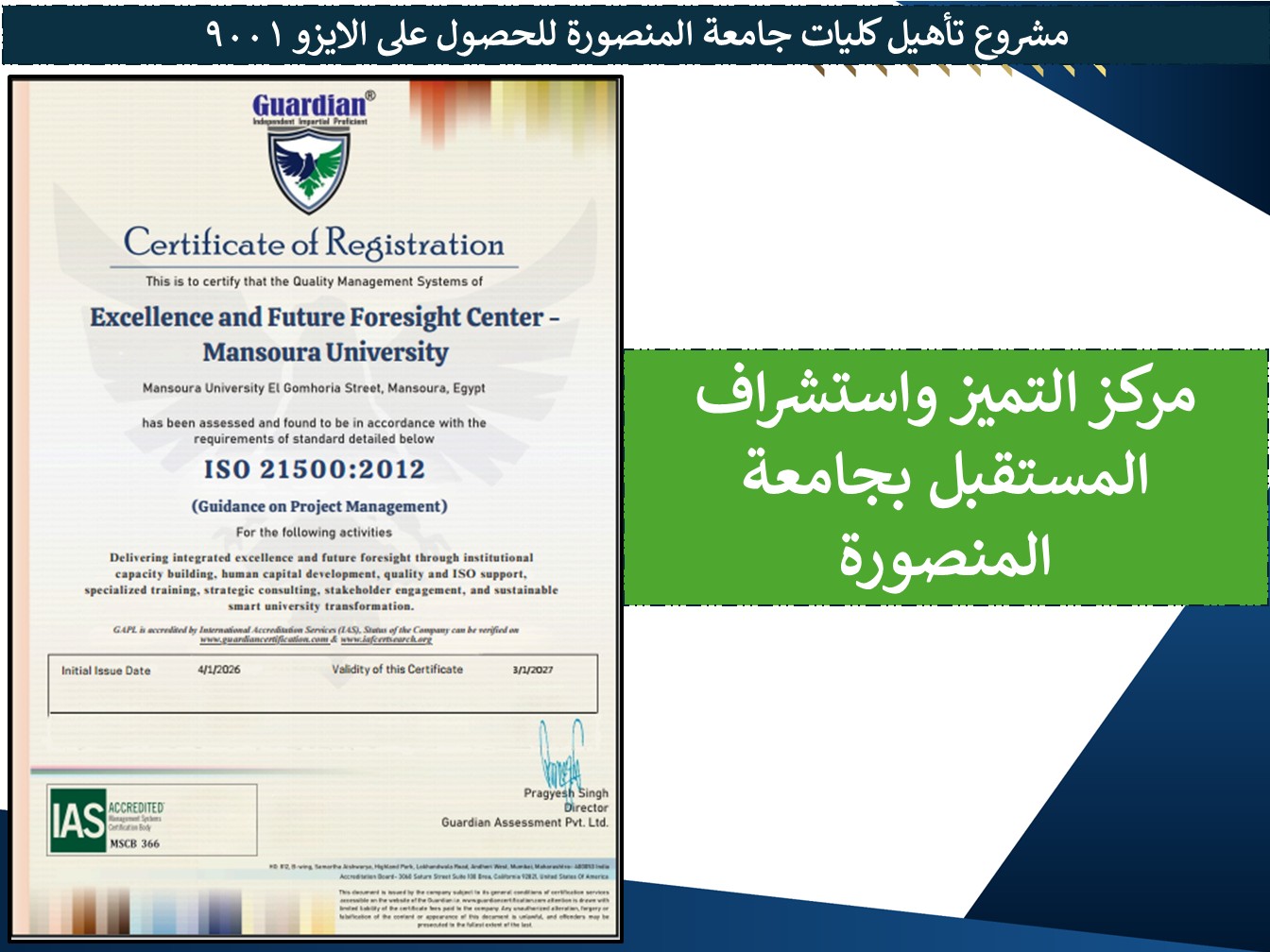 وأضاف رئيس الجامعة أنه في إطار التقدير المهني من الشركة المانحة لما تم تنفيذه من إدارة احترافية ومنهجية دقيقة للمشروع، حصل مركز التميز واستشراف المستقبل بالجامعة على شهادة ISO 21500 الخاصة بإدارة المشروعات، بما يؤكد كفاءة التخطيط والتنفيذ والمتابعة، ويعكس قدرة الجامعة على إدارة المشروعات المؤسسية الكبرى وفق المعايير الدولية المعتمدة.