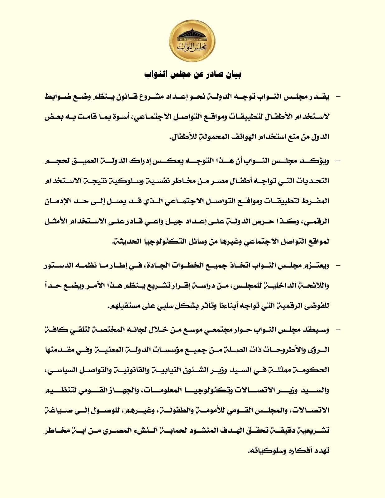 يصدر مجلس النواب بيانا في شأن توجه الدولة لإعداد مشروع قانون ينظم وضع ضوابط لاستخدام الأطفال لتطبيقات ومواقع التواصل الاجتماعي ..