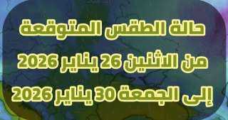 تعرف علي حالة الطقس ودرجات الحرارة المتوقعة اليوم الإثنين الموافق 26 من شهر يناير 2026م. .. .. والتي تأتي كالتالي: