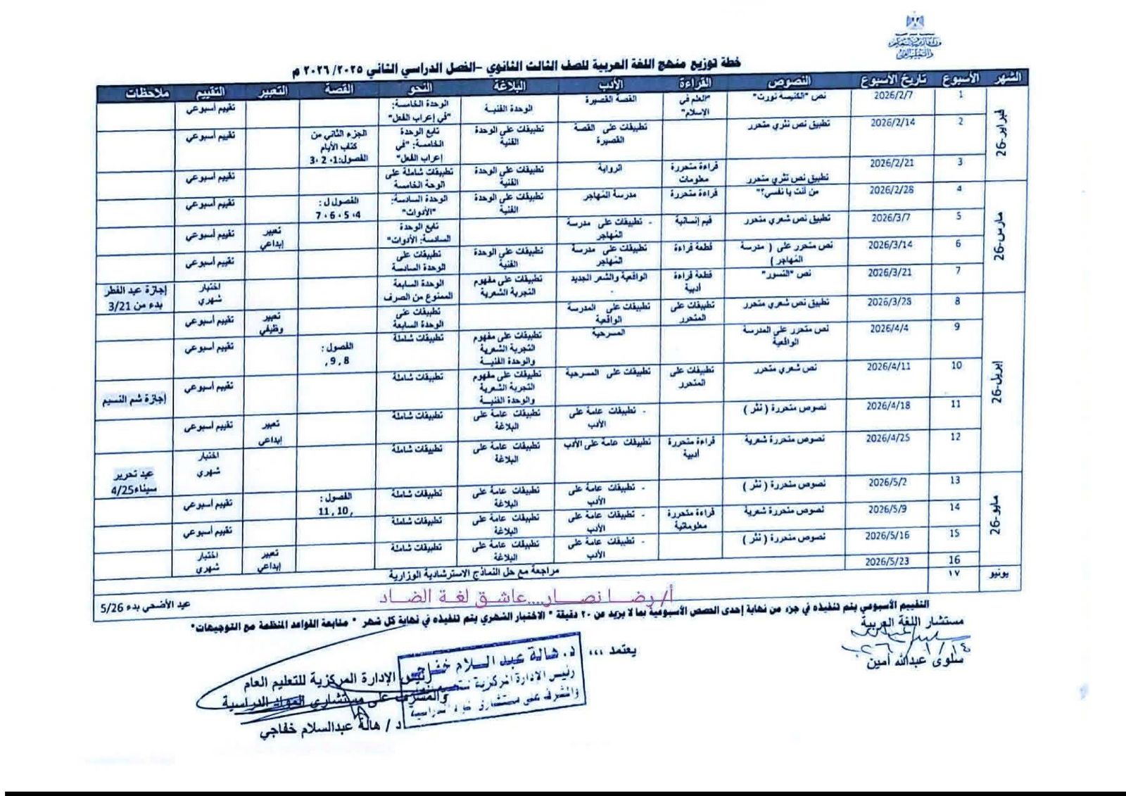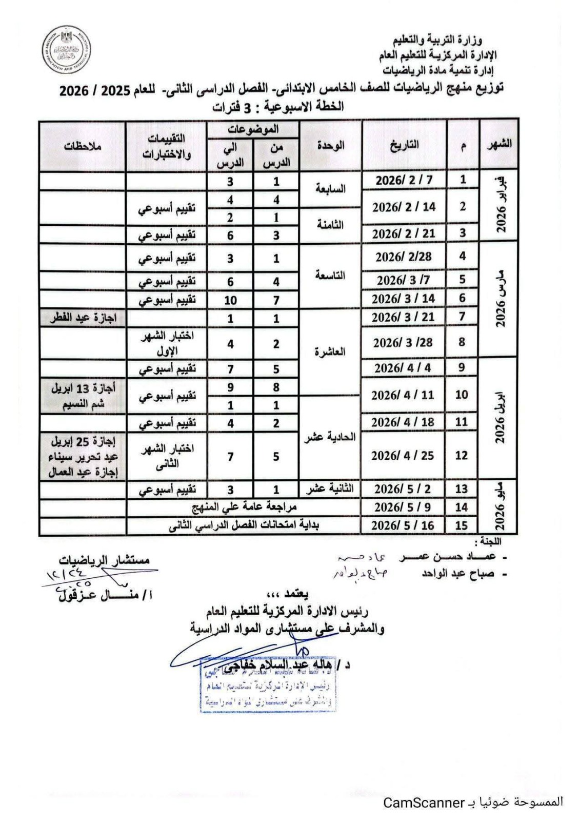- موعد التقييم النهائي للصفين الأول والثاني الابتدائي ( عقد جميع امتحانات المواد خارج المجموع عملي وانشطة ومستوى رفيع ولغة ثانية) من 11 مايو 2026 حتى 13 مايو 2026