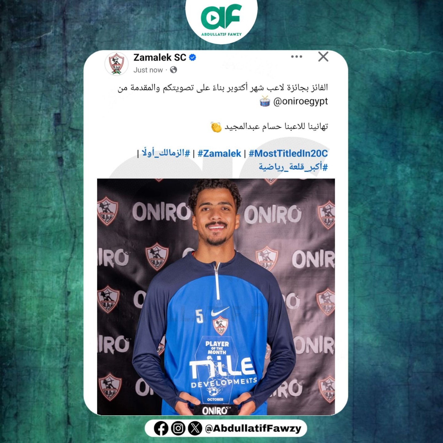 أعلن الحساب الرسمي لنادي الزمالك عن فوز المدافع الدولي حسام عبد المجيد بجائزة لاعب الشهر (أكتوبر)، وذلك بعد مستويات لافته قدمها اللاعب على الصعيدين الدفاعي والهجومي. وجاء اختيار عبد المجيد بناءً على: