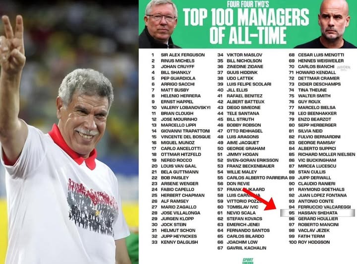دخل حسن شحاتة، المدير الفني الأسبق لمنتخب مصر، قائمة أفضل 100 مدرب كرة قدم عبر التاريخ، وفقًا لتصنيف مجلة «Four Four Two» الإنجليزية الشهيرة.