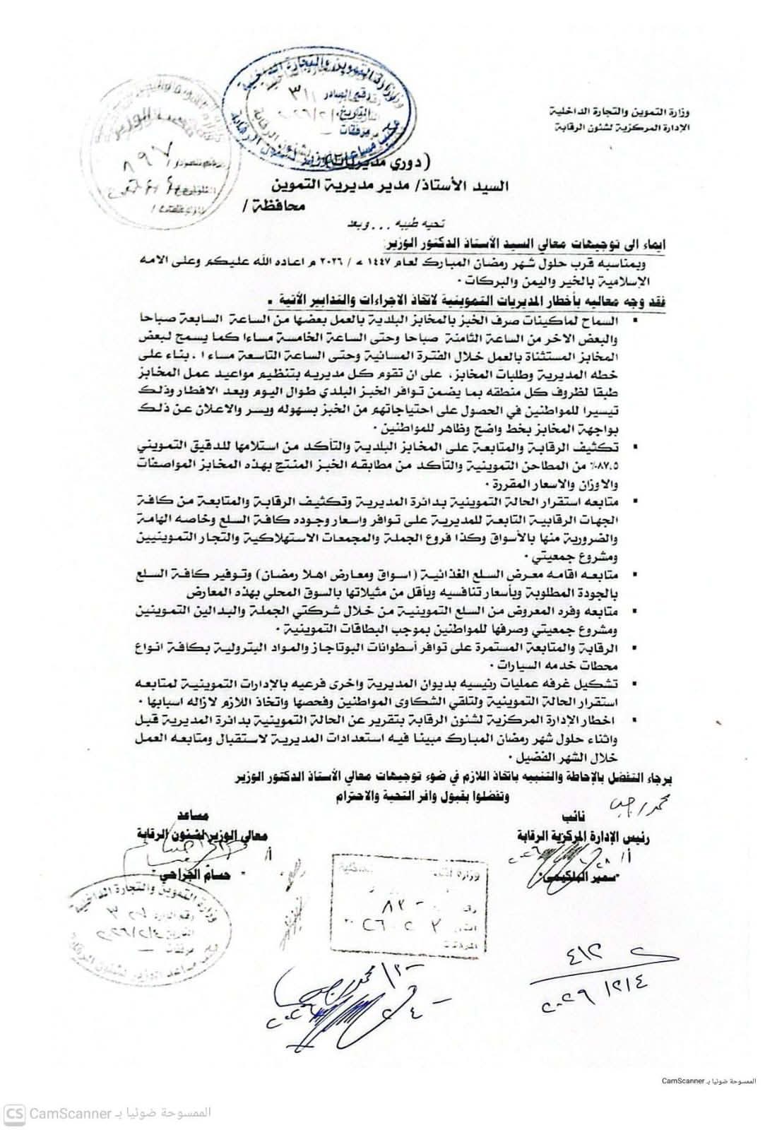 وجهت وزارة التموين والتجارة الداخلية المخابز البلدية على مستوى الجمهورية بتنظيم مواعيد العمل خلال شهر رمضان المبارك، بما يضمن توافر الخبز المدعم للمواطنين وفق احتياجات كل منطقة.