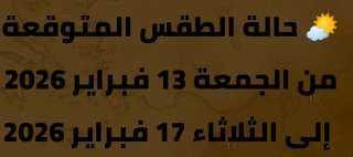 تعرف علي حالة الطقس ودرجات الحرارة المتوقعة اليوم الجمعة الموافق 13 من شهر فبراير 2026م. .. .. والتي تأتي كالتالي:
