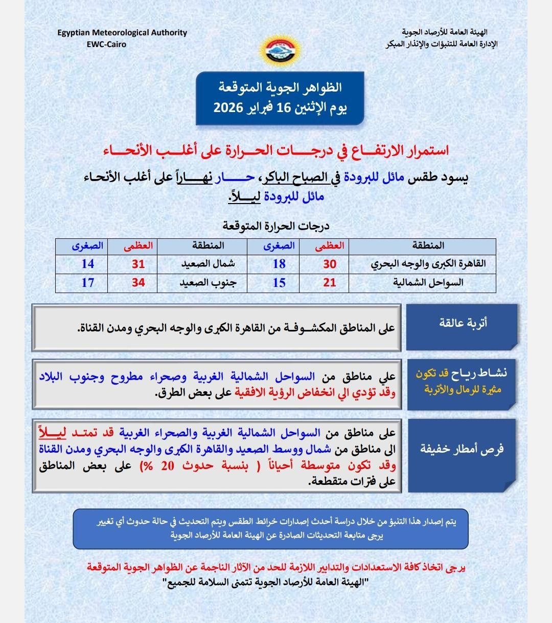 وأضافت الهيئة، إلى وجود نشاط للرياح قد يكون مثيرًا للرمال والأتربة خاصة على السواحل الشمالية الغربية وصحراء مطروح وجنوب البلاد، وقد يؤدي ذلك إلى انخفاض الرؤية الأفقية على بعض الطرق.