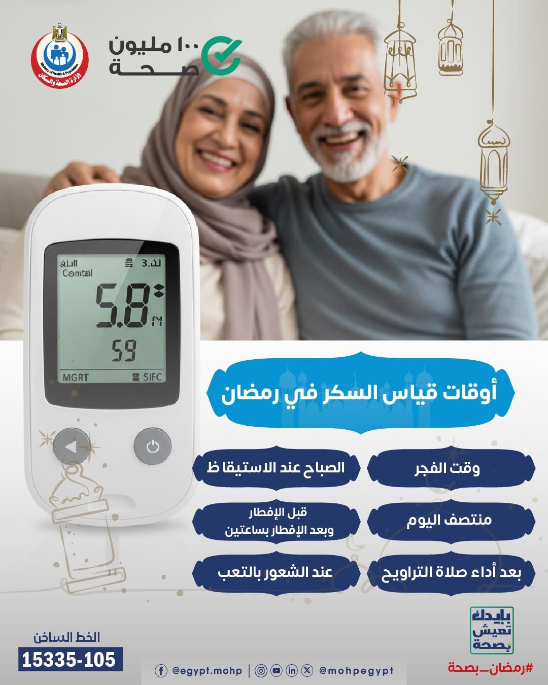 وكشفت وزارة الصحة والسكان، من خلال منشورها التوعوي ، أوقات قياس السكر في رمضان ، بما يعطي نتائج صحيحة والتي جاءت كالتالي :-