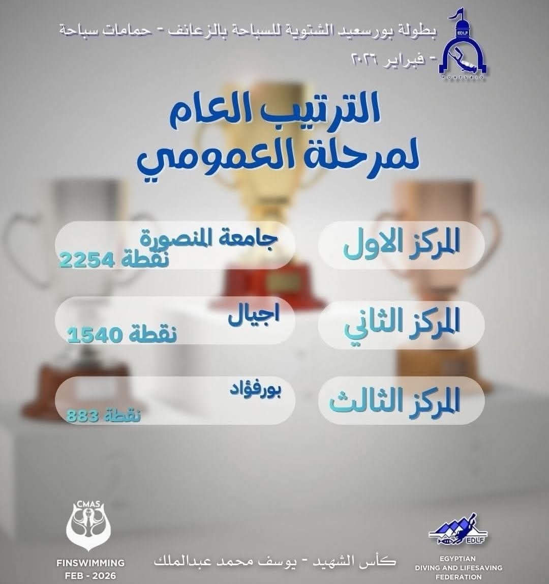 حصدت جامعة المنصورة المركز الأول في بطولة بورسعيد الشتوية للسباحة بالزعانف 2026 ..